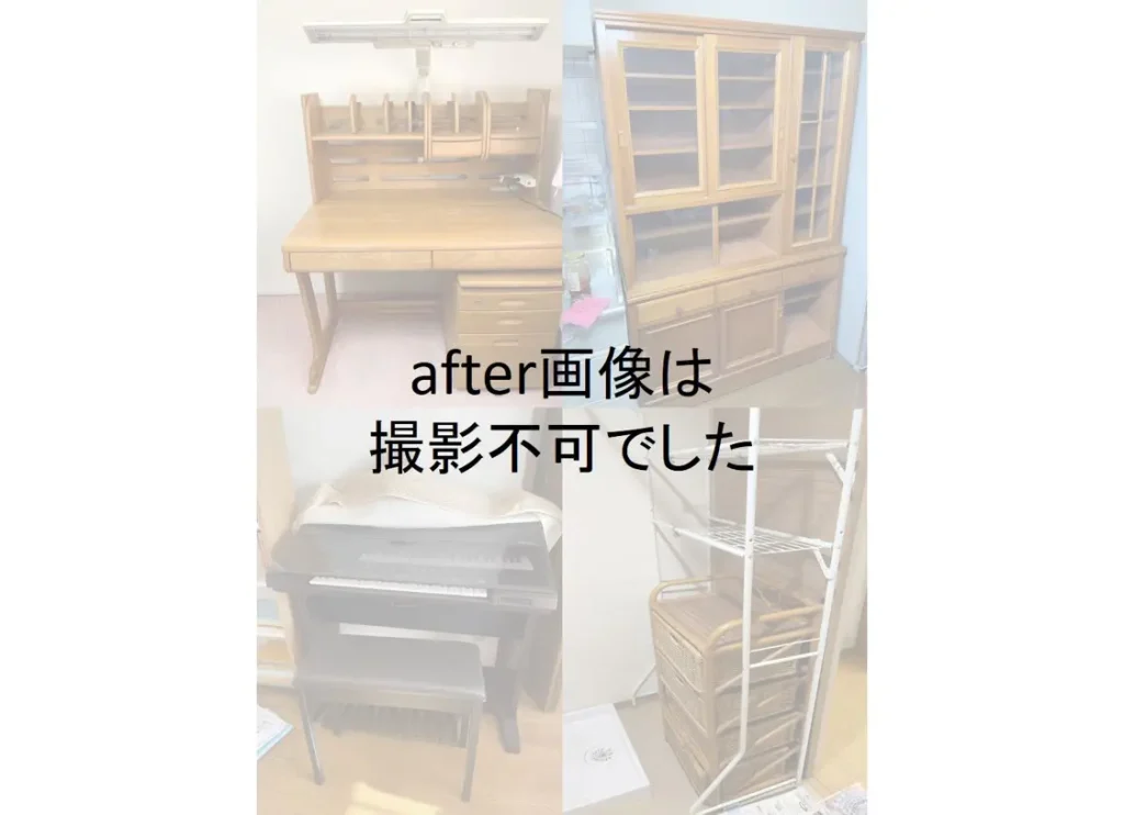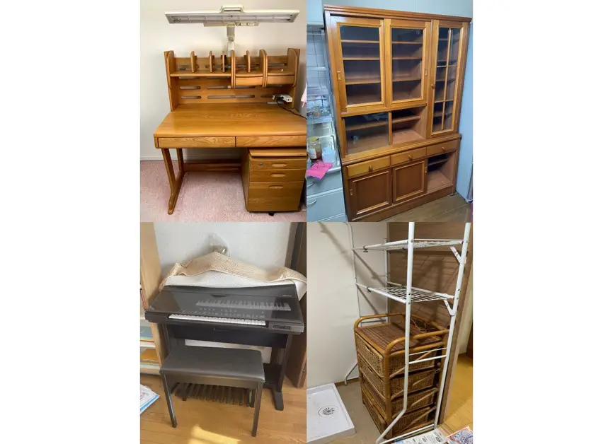 回収品はエレクトーン、学習机、食器棚、籐のタンス、洗濯機ラックの5点。大型家具が多い現場でしたが、エレベーター付きのマンションであったため、搬出時の養生を徹底し、通路や壁に傷がつかないよう注意を払いながら作業を行いました。特に食器棚は上下に分解して台車を使用し、共用部分への配慮を忘れずに搬出いたしました。